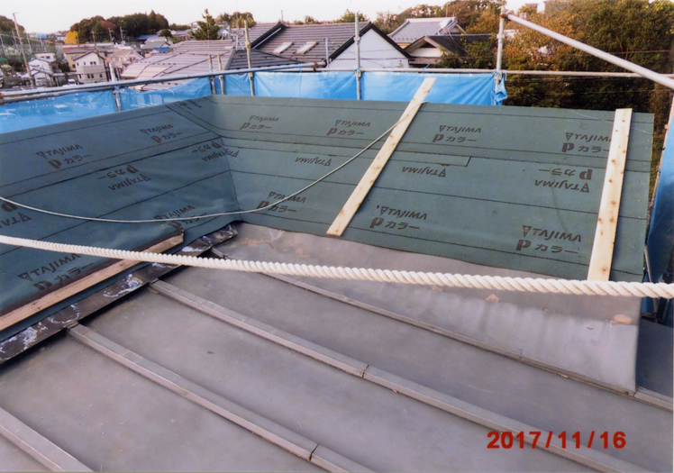 そして、今回は、数年前より2階和室天井から雨漏りが続いているため見て欲しいとのご連絡を頂きました。そこで、屋根廻りを調査しましたところ、比較的に屋根瓦の状態は良好ではありましたが、一枚一枚の屋根瓦がゴム状のシーリング材で密着(新築時にはこの様な工法は皆無)されているため、雨水が抜ける隙間もなく、屋根瓦下地の欠陥のある箇所から室内天井の雨漏りに至ったと判断されました。更に、既存の屋根の造りが、瓦葺きと瓦棒トタン葺きの混在した造りのため、その境目の雨じまいが甘く、特に、大雨と強風の際にはその隙間から室内に雨水が侵入されたとも考えられました。このため、今回は、全ての屋根瓦を撤去し、軽量な金属屋根への葺き替えに加え、雨樋の全面交換もお勧めさせて頂き、約2週間にて全ての作業を終了させて頂きました。そして、このたびの屋根廻りの改修により、お客様も、雨漏りの不安から解消され、また、地震によるお住いの倒壊の危険性からも避けられ、安心・快適にお過ごしになられることと思われます。