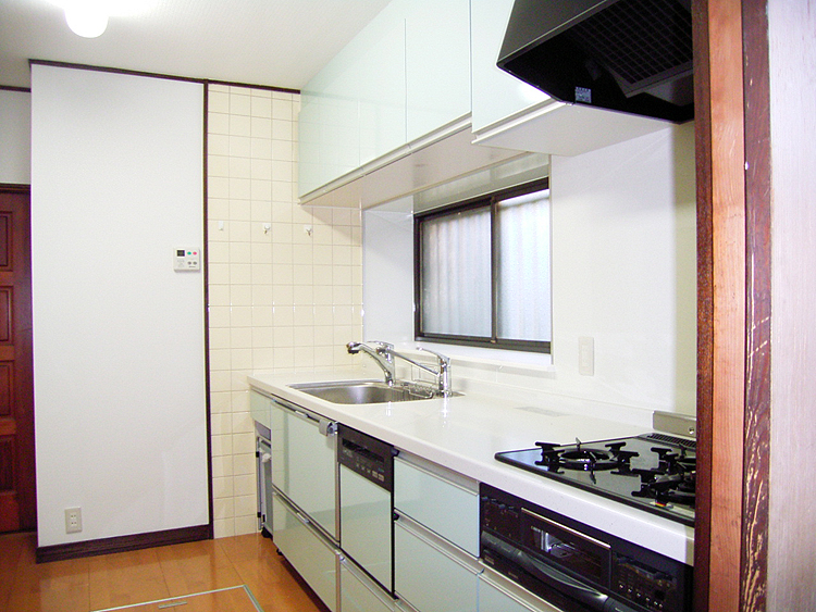 そこで、まず、古くなった流し台、調理台、コンロ台、吊戸棚や換気扇等のすべてを撤去いたしました。さらに、既存の床の各所に緩みやキシミが見られましたので、床下から根太を追加・補強して、新しいフローリング材を重ね張りしました。また、天井・壁はクロスを貼り替え、天井照明器具も取り替えて、キッチン全体が清潔で明るくなりました。